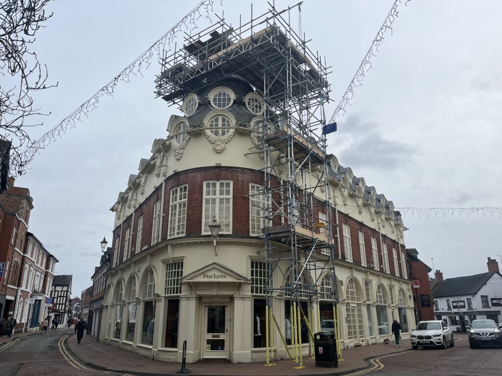 Legat Owen’s Building Surveying team has successfully project managed urgent repairs to the historic roof cone structure below the flagpole at 1–5 Pillory Street, Nantwich, restoring an important architectural feature to one of the town’s most distinctive buildings.