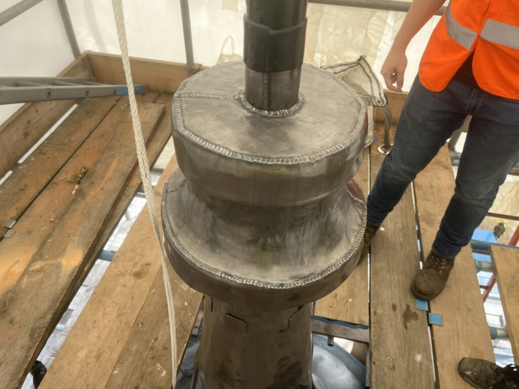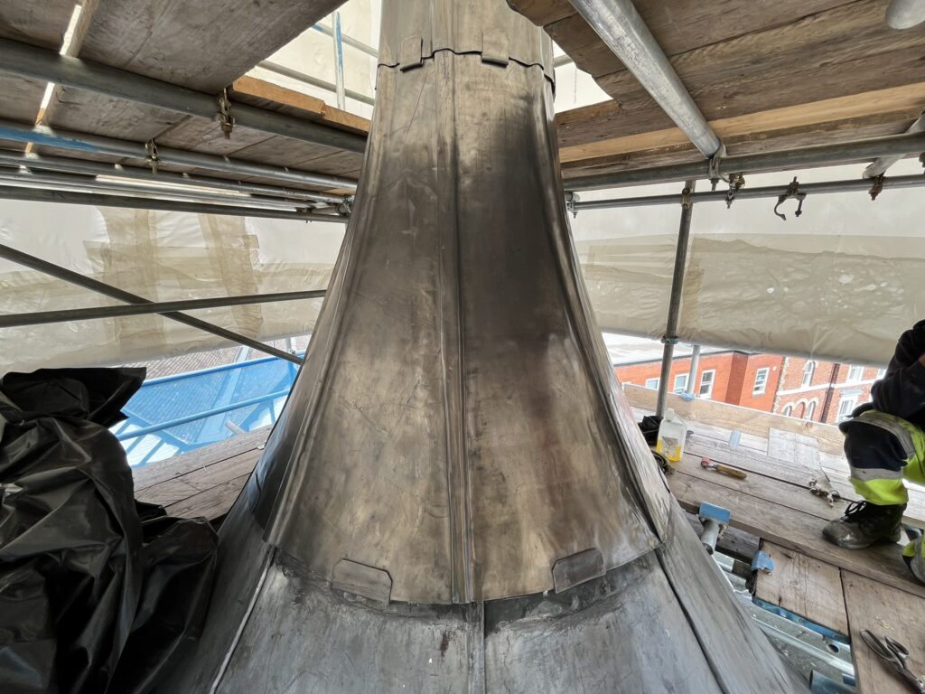 The Legat Owen team was instructed following concerns that the flagpole had begun to lean. A detailed investigation was carried out, which revealed that the top cone structure beneath the lead covering had significantly deteriorated.