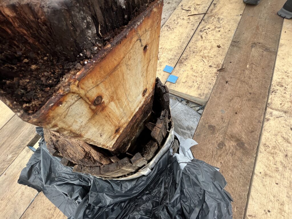During the works, Legat Owen obtained two specialist scaffold proposals that incorporated a cantilever design to safely access the leaning flagpole. The team then removed the lead covering and discovered that the top cone structure beneath it had rotted. They liaised closely with the conservation officer and secured consent to carry out the necessary repairs. Timber and leadwork specialists were appointed to rebuild and re‑wrap the cone structure in line with heritage requirements. Once the restoration was completed, the fully repaired flagpole was refitted to its original position.